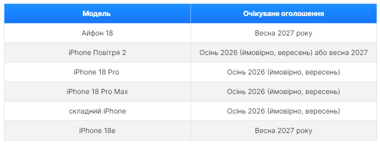 Очікується, що восени 2026 року Apple представить iPhone 18 Pro, iPhone 18 Pro Max і, ймовірно, довгоочікуваний складний iPhone. А ось базовий iPhone 18 та iPhone Air 2 можуть вийти значно пізніше — навесні 2027 року разом із новим доступнішим iPhone 18e.