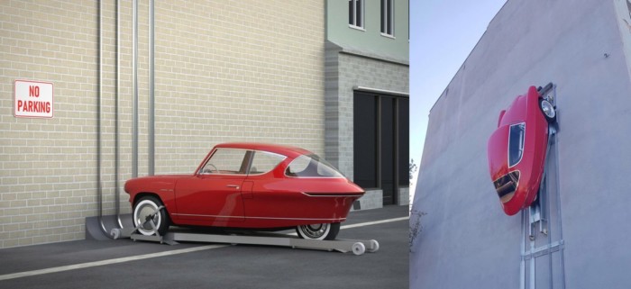 У Nobe 100 усього три колеса: одне ззаду та два спереду. Дизайн електрокара перегукується з епохою середини минулого століття. Вага машини становить лише 600 кілограмів. Але найбільший “сюрприз” новинки – можливість паркування на стіні. І спеціально для цього інженери передбачили систему кріплень, кронштейни та відповідні направляючі для установки на стіну.