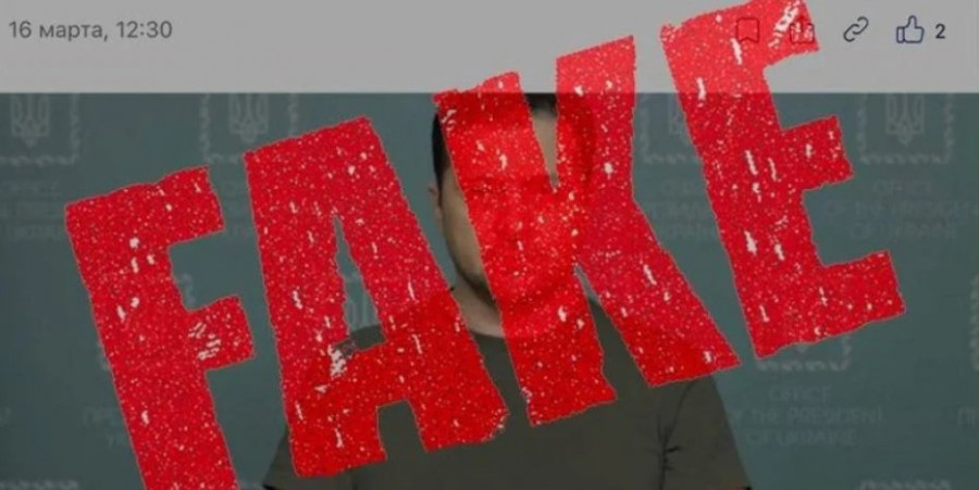 Цей ролик, у якому президент України закликає скласти зброю, з’явився в ефірі телеканалу «Україна 24», зламаному хакерами. Саме відео носить очевидні ознаки фальшування — так, голова Володимира Зеленського виглядає чужорідно на тлі шиї та торса.
