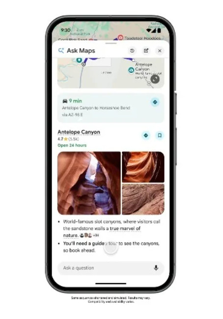 Функція Ask Maps дозволяє ставити карті запитання звичайною мовою. Наприклад, можна попросити знайти місце для зарядки телефону без черги або освітлений тенісний корт поблизу. Система аналізує дані про понад 300 мільйонів локацій і відгуки сотень мільйонів користувачів, після чого пропонує варіанти та показує маршрут.