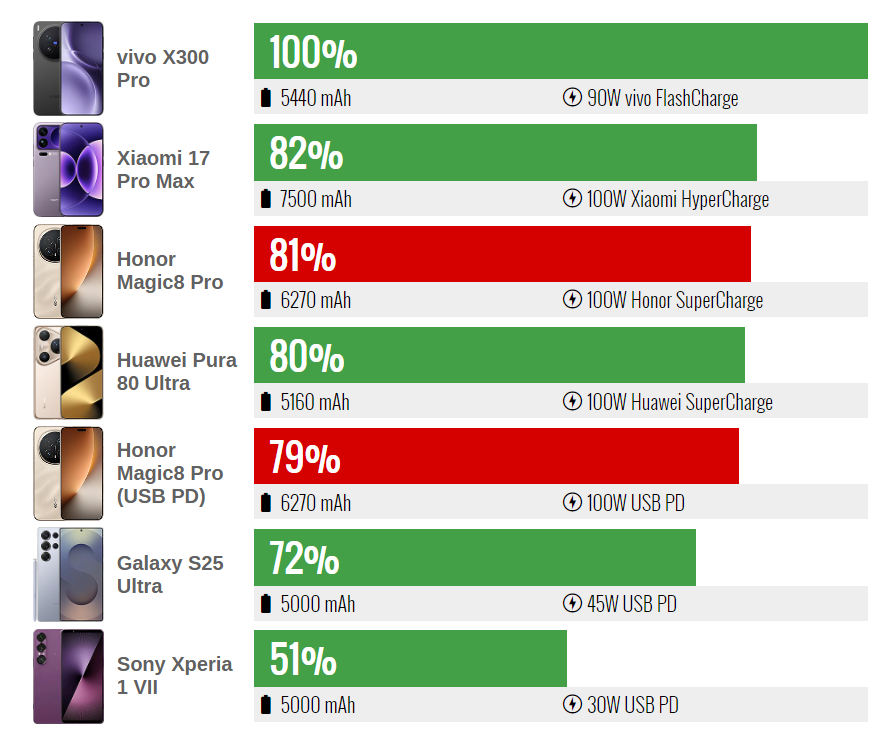 У змішаному сценарії використання пристрій витримав 19 годин 7 хвилин, що помітно краще від попереднього покоління та багатьох конкурентів. Попереду залишився лише Oppo Find X9 Pro з батареєю 7500 мАг.