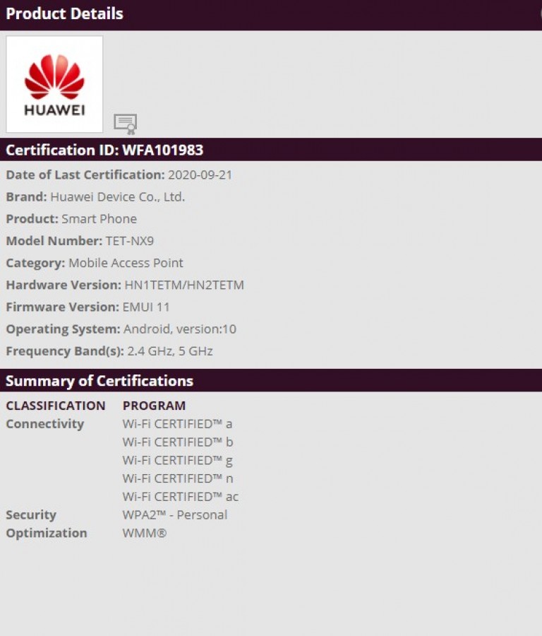Нещодавно в базі даних регулюючого органу Китаю TENAA з’явився пристрій Huawei з кодовою назвою Teton — вважається, що це саме Mate X2. Тепер цей же апарат вже під назвою TEX-NX9 пройшов сертифікацію Wi-Fi Alliance, що вказує на його швидкий запуск. У скріншоті сертифікації Wi-Fi для Mate X2 зазначається, що пристрій підтримує Wi-Fi 6 і працює під управлінням Android 10.