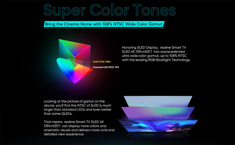 Розробники позиціонують технологію SLED як альтернативу дисплеям на основі квантових точок (QLED). У системах підсвічування більшості сучасних LED-матриць використовуються сині світлодіоди, світло яких перетворюється в білий з допомогою спеціальних фільтрів. Новинка ж отримала набір з червоного, зеленого і синього елементів (RGB). За словами компанії, це дозволить смарт-телевізору передавати більше кольорів для яскравого візуального сприйняття.