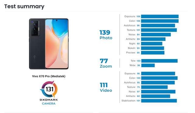 За підсумками всіх тестів vivo X70 Pro отримав 131 бал, що стало найкращим результатом у категорії “Преміум”. Смартфон навіть впритул наблизився до сегмента “Ультра Преміум” і майже не поступається дорожчому vivo X70 Pro+ (135 балів), а в деяких категоріях, таких як автофокус, навіть перевершує його.