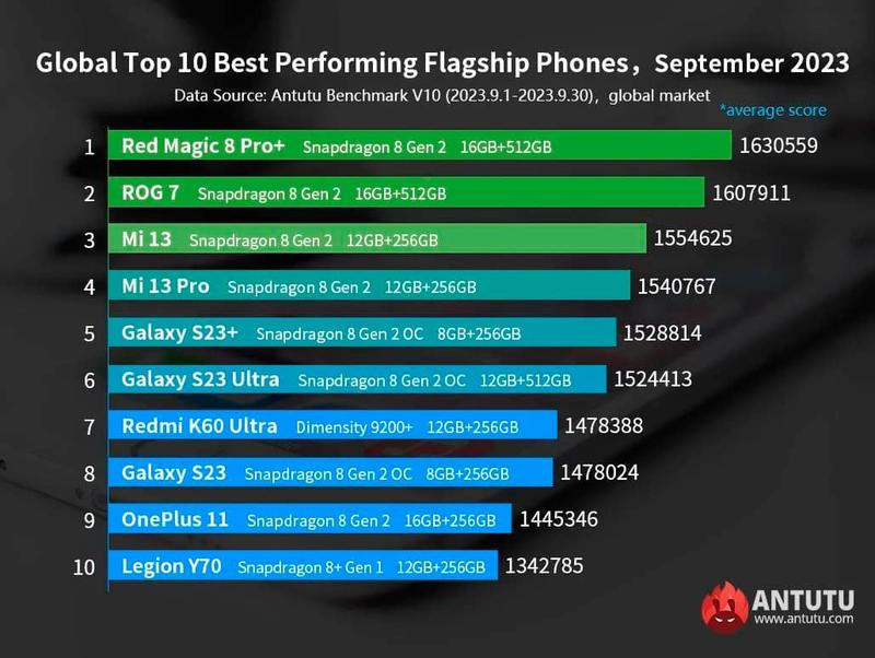 На офіційному вебсайті AnTuTu з’явився свіжий рейтинг найпотужніших у світі флагманських смартфонів. Серед смартфонів, що працюють на платформі Android, лідером стала модель Red Magic 8 Pro+. Друге місце дісталось смартфону Asus ROG Phone 7. Третім у цьому списку став Xiaomi 13.