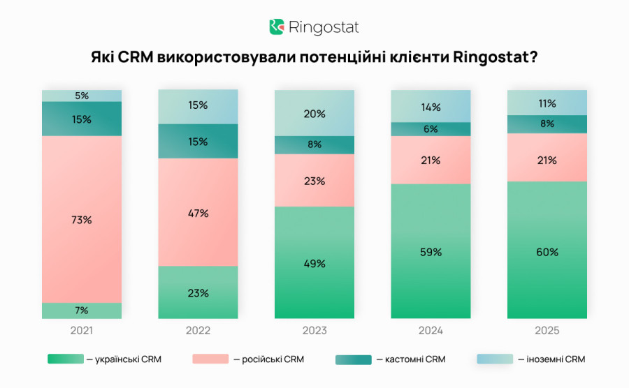 Примітка. Ringostat не підтримує сервіси країни-агресора. Дані про використання російських CRM отримані зі слів потенційних клієнтів і використовуються виключно в аналітичних цілях.