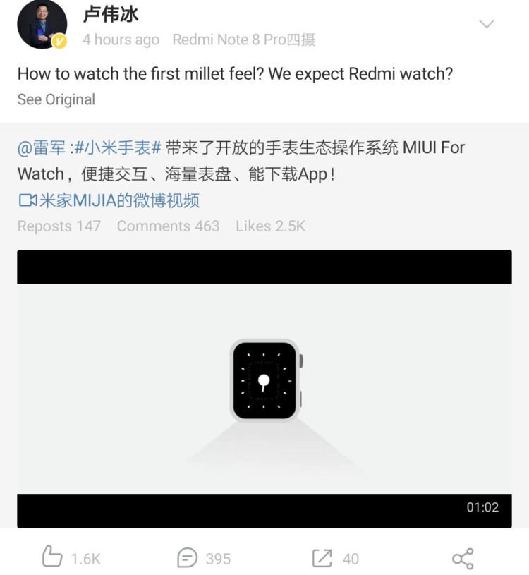 Буквально вчора компанія Xiaomi показала свій перший “розумний” годинник Mi Watch. Віце-президент компанії Лу Вейбінг, а за сумісництвом і голова Redmi, вирішив уточнити у користувачів, чи сподобалася їм новинка, а також натякнув на вихід аналогічного пристрою від Redmi.