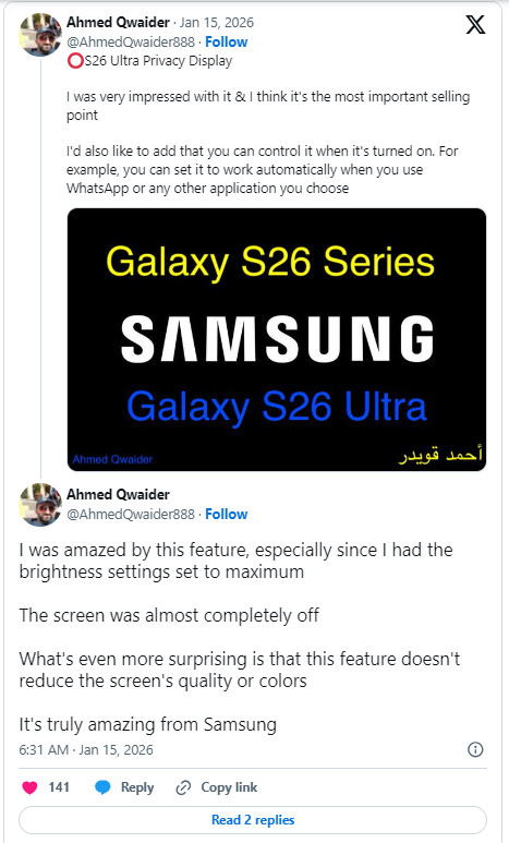 Очікується, що Galaxy S26 Ultra запропонує гнучкі налаштування: автоматичне увімкнення в банківських застосунках або навіть керування через Galaxy AI, яка сама визначатиме, коли хтось заглядає у смартфон. Найцікавіше — навіть на максимальній яскравості на вулиці текст залишатиметься невидимим збоку, без втрати чіткості, контрасту та точності кольорів.