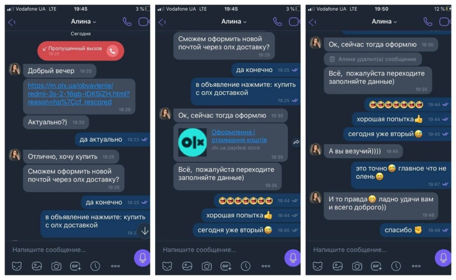 Дану інформацію надав Віктор Водолага, учасник харківської велошколи. За заявою даної людини, його дівчину намагалися обдурити шахраї, використовуючи сайт OLX, проте в обох випадках спроби не увінчалися успіхом. При цьому злочинці придумали класичну стратегію обману, яка базується на виведенні жертви за межі майданчика і виманюванні даних карти. Детальніше – шахраї відгукуються на оголошення, в яких вказана продаж будь-якого предмета, потім телефонують продавцеві і пропонують укласти угоду за допомогою сервісу «OLX-Доставка». Коли жертва погоджується, їй надсилається посилання на підроблену сторінку, яка за зовнішніми ознаками практично ідентична продукту OLX, проте на ділі виявляється фішинговою (сторінка, яка викрадає дані користувача). Там користувач заповнює форму, в якій вказує всю інформацію по своїй карті, нібито для отримання оплати – номер, захисний код, залишок на рахунку.