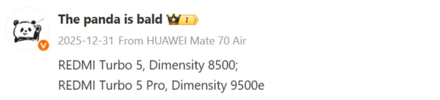 У січні на китайському ринку очікується хвиля нових смартфонів, і серія Redmi Turbo 5 вже привертає підвищену увагу. За свіжим витоком з Weibo, Redmi Turbo 5 працюватиме на ще не представленому чипі MediaTek Dimensity 8500, тоді як Turbo 5 Pro отримає потужніший Dimensity 9500e.