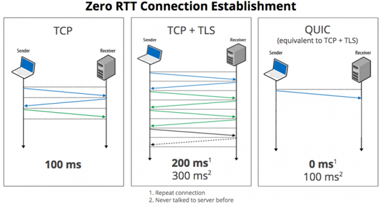 Протокол QUIC, на відміну від використовуваного зараз TCP, передбачає передачу даних в мережі виключно в зашифрованому вигляді. Крім того, завдяки спеціальній технології, втрачені пакети даних можуть дуже швидко відновлюватися, що забезпечує більш високу швидкість з’єднання та істотне зменшення відгуку (аж до 0 мс при повторному з’єднанні між хостами).