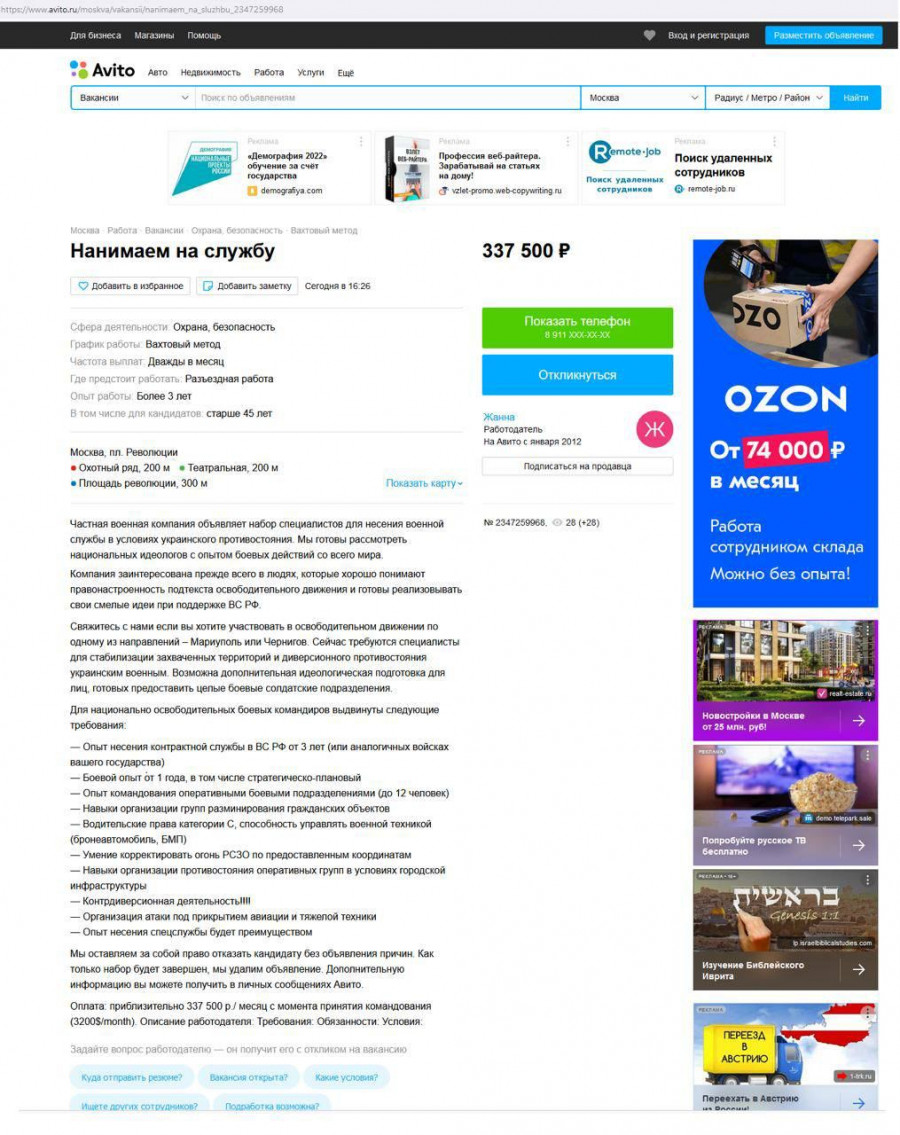 Уряд України закликає холдинг якнайшвидше зупинити бізнес у країні-агресорі, а також видалити з сайту Avito оголошення про пошук найманців для війни в Україні. За вбивство мирних українців, до речі, платять 300 тисяч рублів на місяць і пропонують “гнучкий графік” роботи.