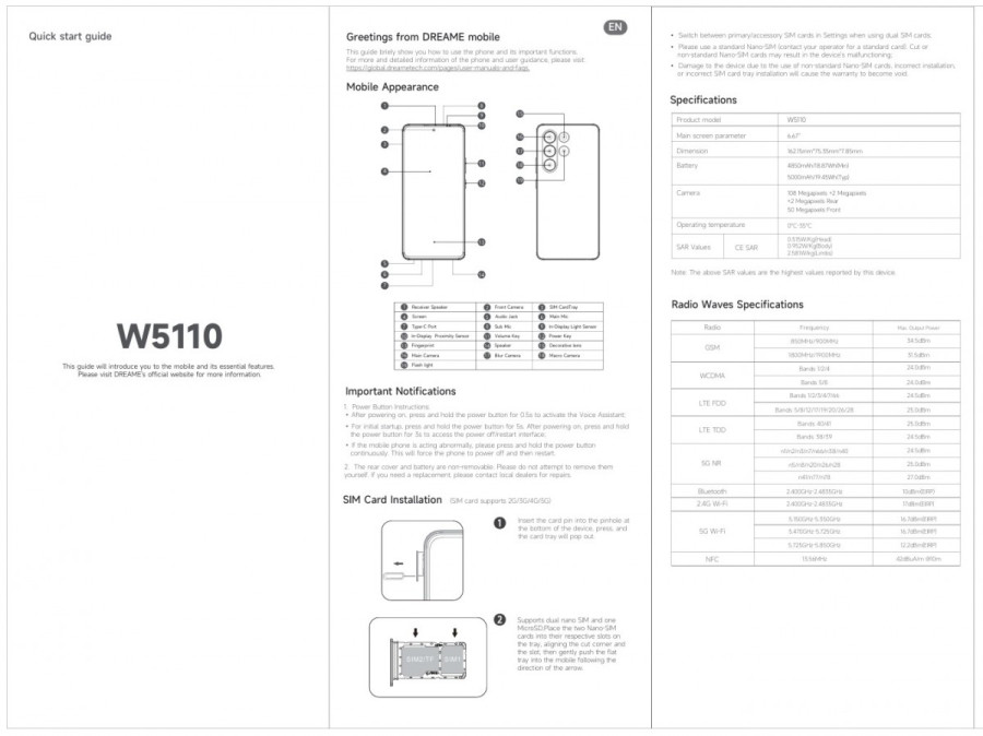 Смартфон з модельним номером W5110 отримає 6,67-дюймовий AMOLED-дисплей. Основна камера складається з 108 Мп головного сенсора, а також 2 Мп макрокамери і 2 Мп датчика глибини. На задній панелі є ще один декоративний сенсор. Фронтальна камера — 50 Мп, що нетипово для пристрою цього класу. За ескізами з інструкції дизайн смартфона дуже нагадує Galaxy S Ultra.